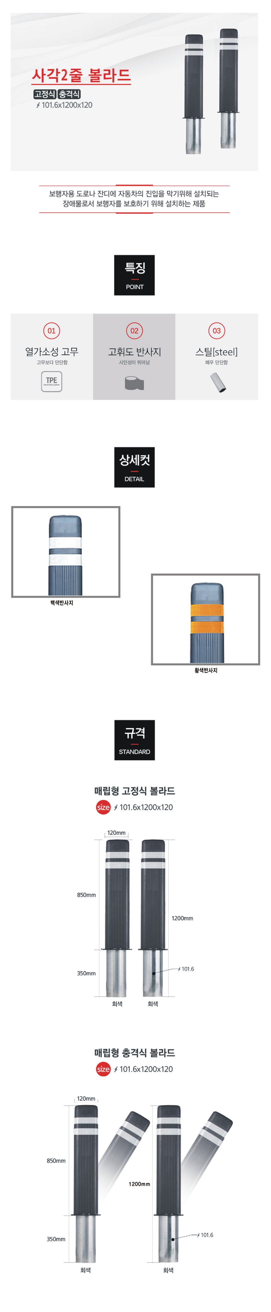 [H-9 탄성볼라드 사각 볼라드] 충격식/사각2줄 매립