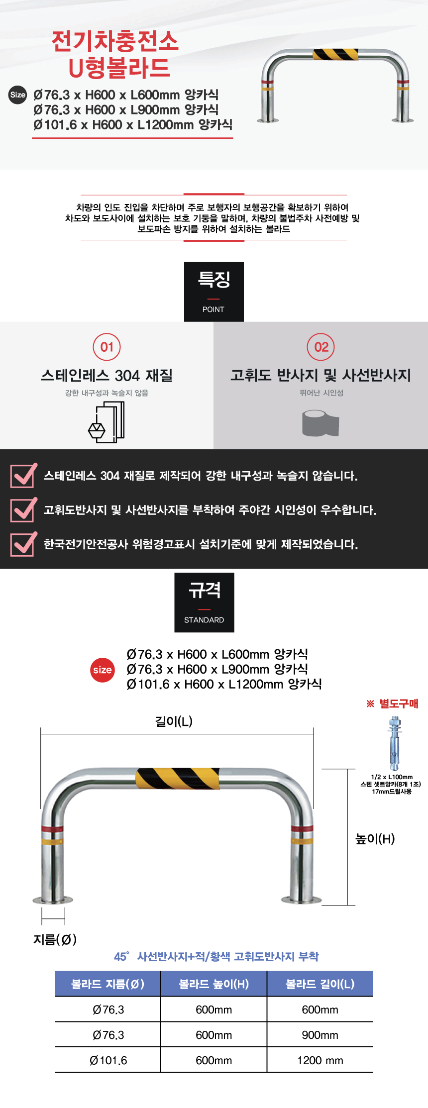 [H-46 추락방지(U형볼라드) 스텐U형볼라드 (특수 사이즈 주문가능)] 전기차충전소 U형볼라드(앙카식)